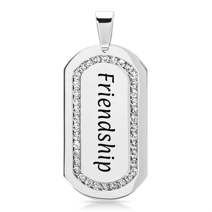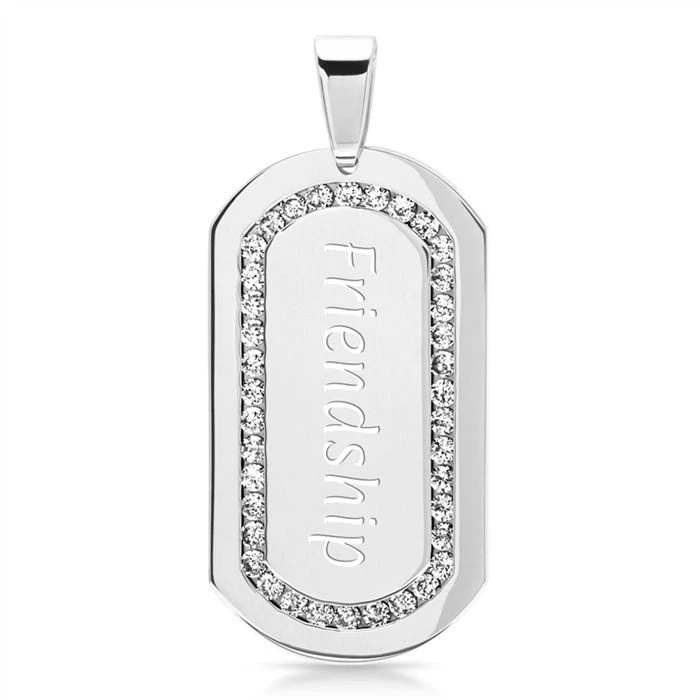 Moderne pendentif plaque en acier inoxydable certi de zirkoniums. Une chaine assortie est disponible en option. Une gravure est offerte.