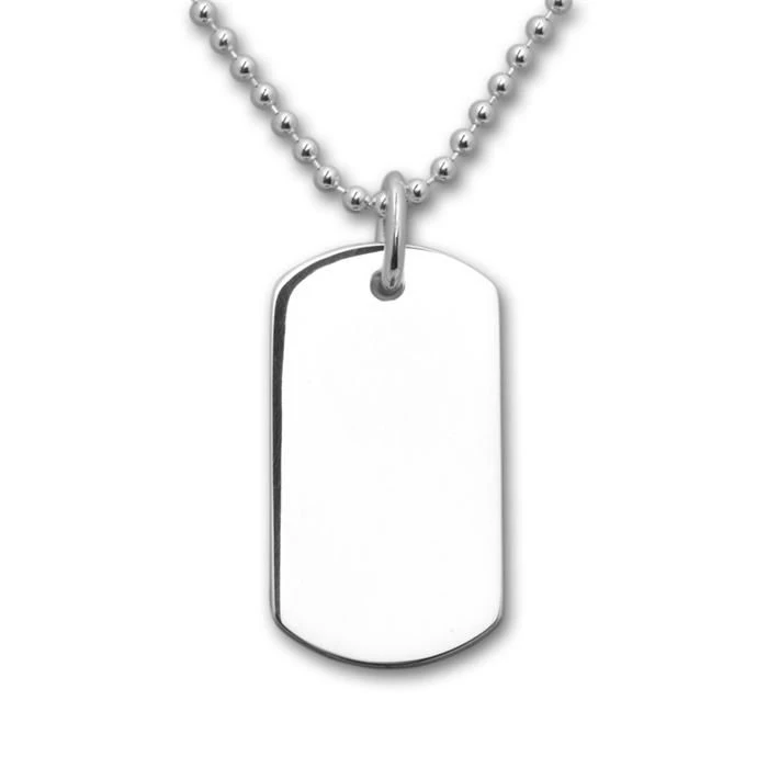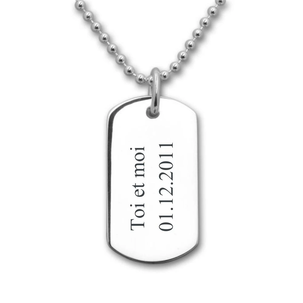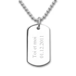 Joli petit pendentif dogtag avec plaque d’identitĂ© en argent 925 poli. Il peut ĂŞtre gravĂ© de chaque cotĂ© sur 3 lignes avec une première gravure diamant est offerte. Une chaĂ®ne optionnelle assortie en argent ou caoutchouc complĂ©tera votre pendentif personnalisĂ©. C’est un cadeau très sympa Ă offrir pour toutes les occasions.