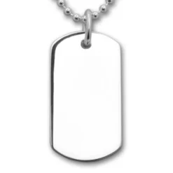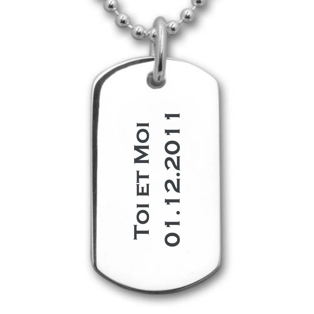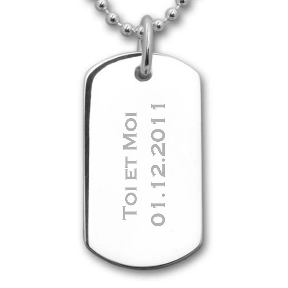 Très beau pendentif plaque d’identitĂ© en argent 925 poli. Il peut ĂŞtre gravĂ© de chaque cotĂ© sur 3 lignes avec une première gravure diamant est offerte. Une chaĂ®ne optionnelle assortie en argent ou caoutchouc complĂ©tera votre pendentif personnalisĂ©. C’est un cadeau très sympa Ă offrir pour toutes les occasions.