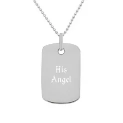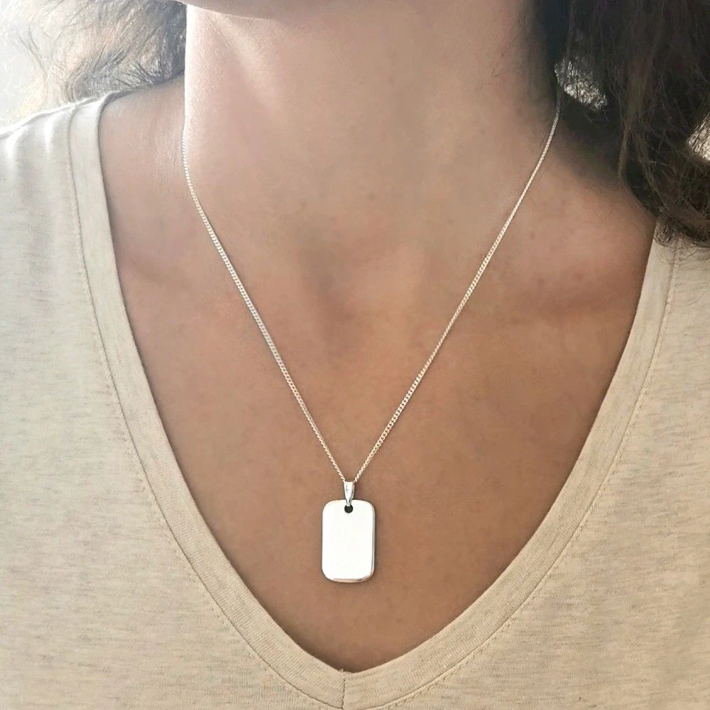Très beau et stylĂ© pendentif plaque d’identitĂ© en argent 925 poli. Il peut ĂŞtre gravĂ© de chaque cotĂ© sur 3 lignes avec une première gravure diamant est offerte. Une chaĂ®ne optionnelle assortie en argent ou caoutchouc complĂ©tera votre pendentif personnalisĂ©. C’est un cadeau très sympa Ă offrir pour toutes les occasions.