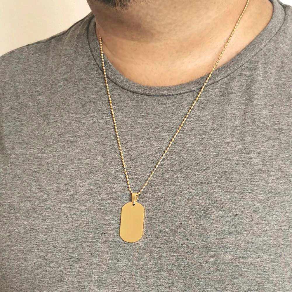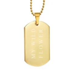 Moderne pendentif plaque en acier inoxydable doré personnalisable au recto et au verso avec une gravure offerte. Ce magnifique pendentif peut être accompagné d’une chaîne bille assortie pour plus de style et d’élégance. Possibilité de graver à l’horizontal et à la verticale ce qui offre beaucoup d’espace pour une gravure plus longue. C’est un cadeau magnifique à offrir pour un anniversaire par exemple.