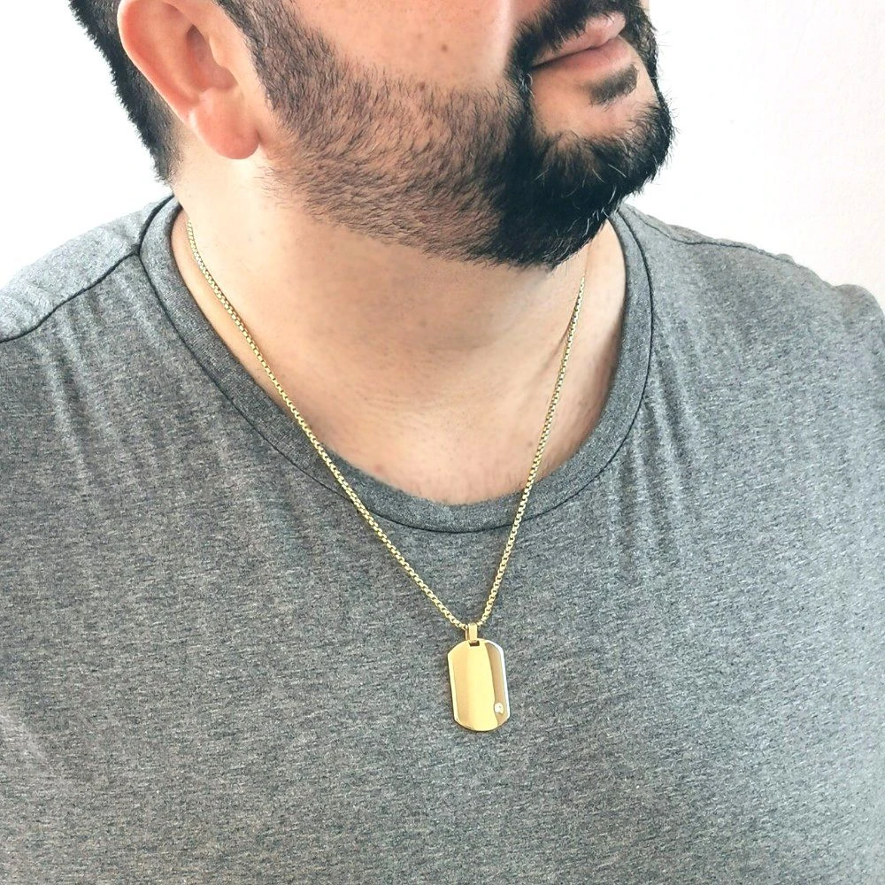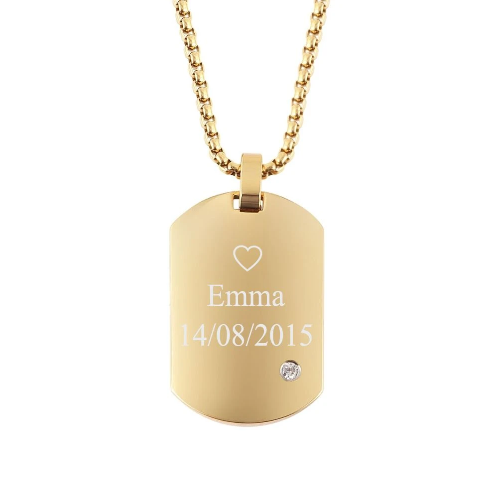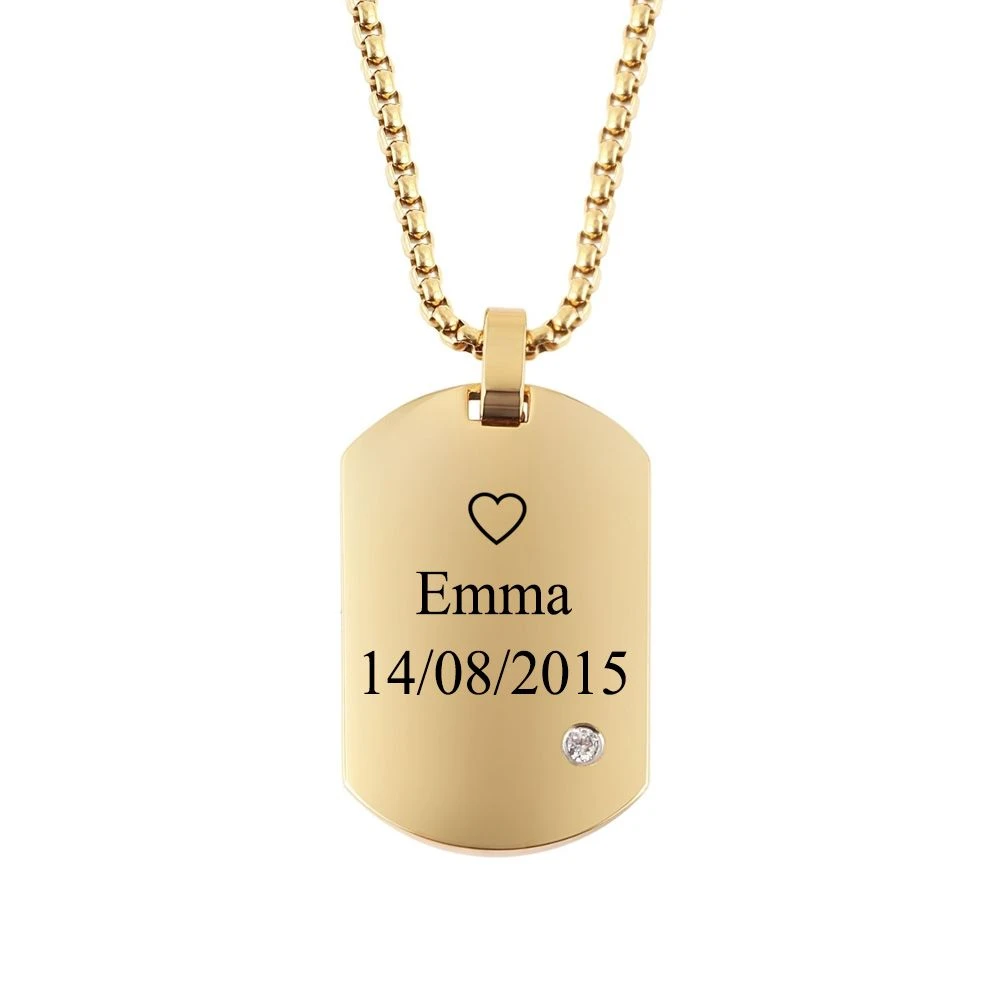 Ce magnifique collier en acier doré est composé d’une plaque décoré d’un stras et d’une chaîne assortie. Vous pouvez le faire graver sur 3 lignes au recto et au verso. A vous de créer le bijou qui vous correspond. Pour vous ou pour offrir le dogtag est un bijou intemporel.