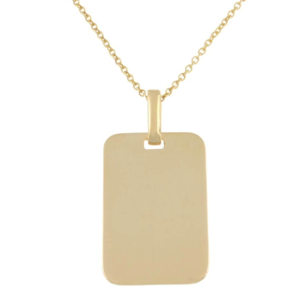 Joli petit pendentif plaque d’identité en plaqué or poli. Il peut être gravé de chaque coté sur 3 lignes avec une première gravure diamant offerte. Une magnifique chaîne assortie en option complétera votre pendentif personnalisé. C’est un cadeau très élégant à offrir pour toutes les occasions.