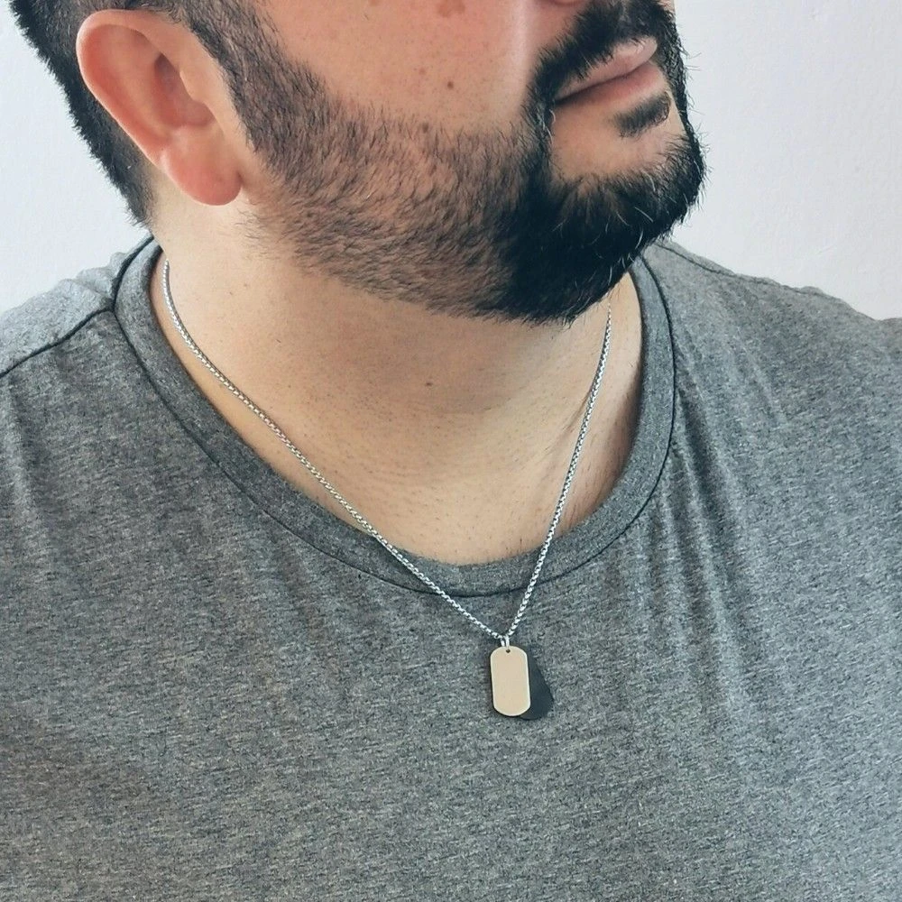 Ce pendentif original est composĂ© de deux plaques personnalisables avec une gravure possible sur chacun. Le plus grand est en acier noir mat et l’autre, plus petit, en acier poli au fini brillant, vient se poser sur le premier. Il est possible d’accompagner ce pendentif d’une chaĂ®ne en option.