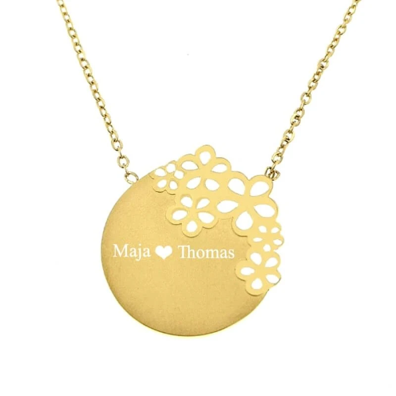 Très joli pendentif en acier inoxydable doré décoré de plusieurs motifs fleurs. Personnalisable au recto/verso, la première gravure diamant est offerte. Le côté recto offre un bel aspect brillant et le côté verso est plus mat. Ce pendentif est accompagné d’une jolie chaîne doré assortie, réglable grâce à une rallonge d’anneaux adaptée permettant de porter ce bijou plus près du cou pour un autre style. C’est un magnifique cadeau à offrir pour des femmes et enfants rêveurs.