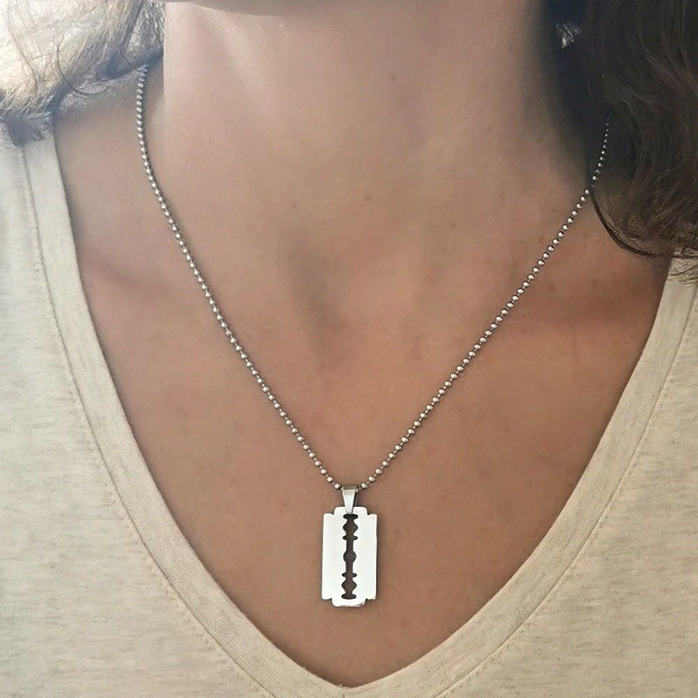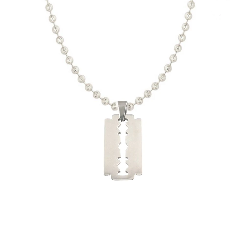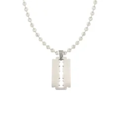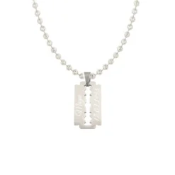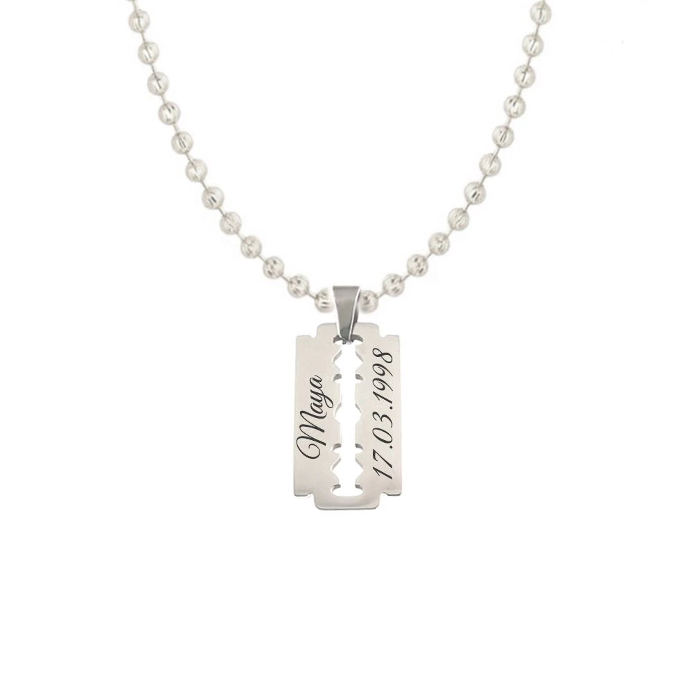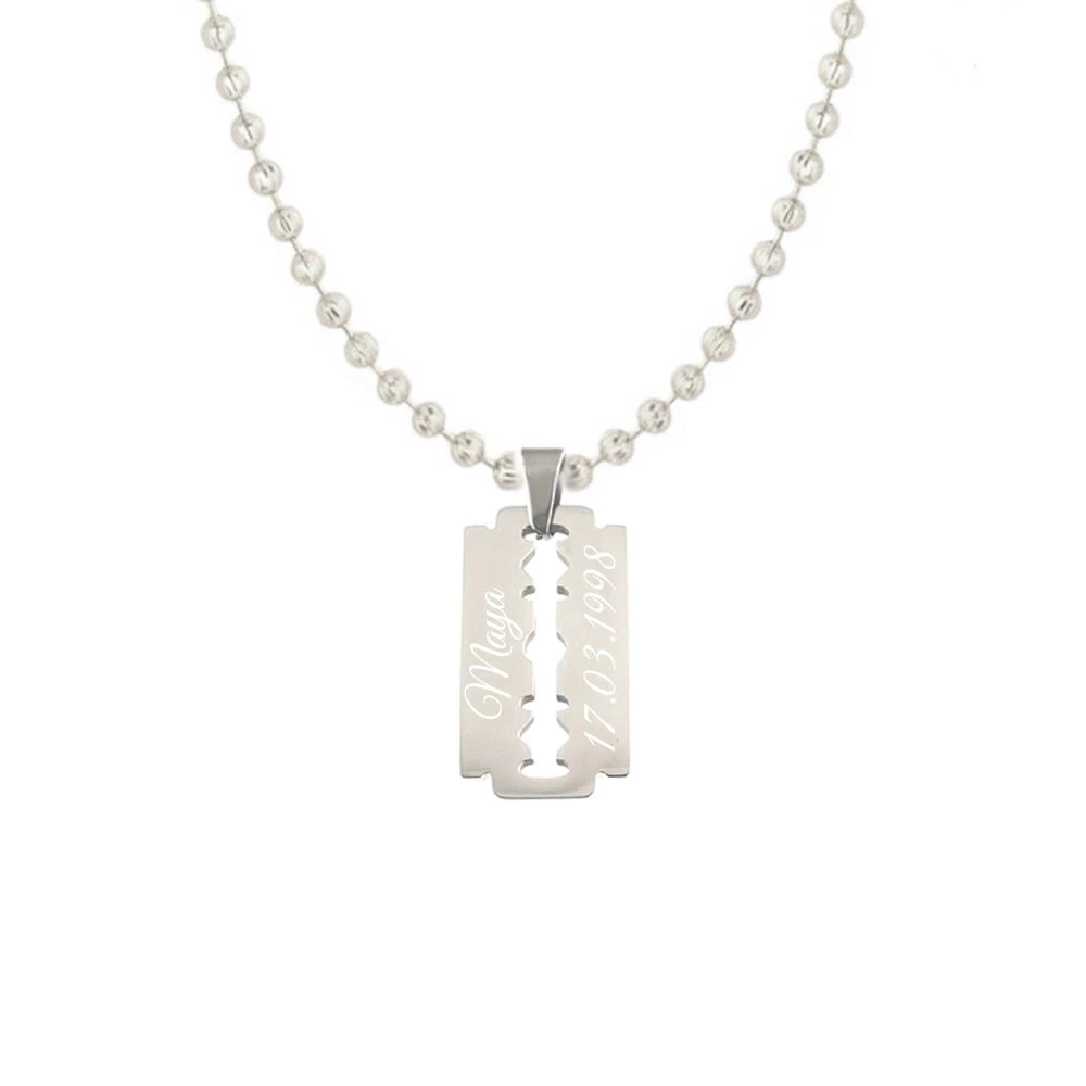 Moderne pendentif lame de rasoir en acier inoxydable poli. Il peut être gravé sur une ou deux lignes en 6 polices de style différent, la première gravure diamant est offerte. Une chaîne optionnelle en acier, en cuir ou en caoutchouc complètera votre pendentif personnalisé.