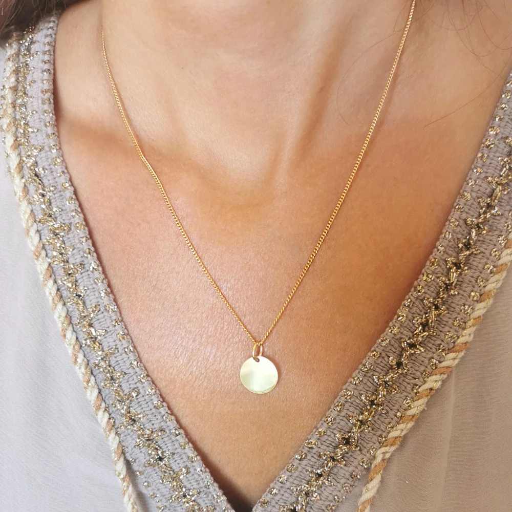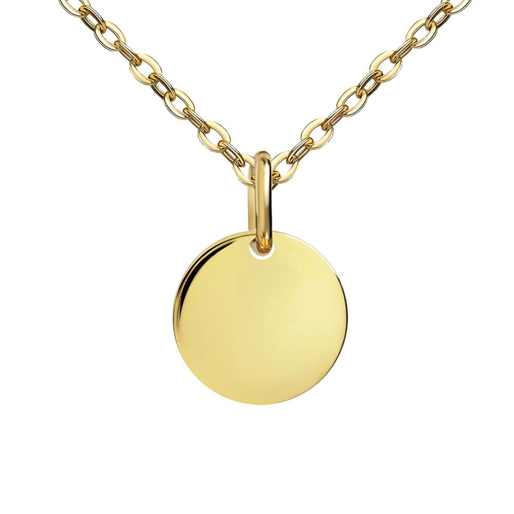 ElĂ©gant pendentif rond en or 333 poli. A la fois discret et chic, laissez place Ă votre imagination pour graver au recto et au verso un nom, une date ou encore un symbole. Profitez de la première gravure diamant offerte. C’est parfait comme cadeau à offrir pour une naissance, un baptĂŞme ou encore un anniversaire. Une chaĂ®ne assortie est disponible en option.