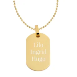 Ce joli pendentif style militaire peut séduire autant les hommes que les femmes. En acier doré, vous pourrez graver le texte de votre choix. Personnalisable au recto et au verso, vous avez le choix du nombre de lignes et de la police de caractère. Il n’attend plus que vous pour briller à votre cou. Vous pouvez choisir une chaine assortie en option, la première gravure diamant est offerte.