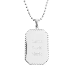 Pendentif plaque en acier inoxydable pour femme ou pour homme personnalisable avec une gravure diamant offerte. Sa forme et son contour fantaisie s’adaptent autant aux personnes qui ont un look élégant et discret qu’aux personnes qui aiment l’originalité.