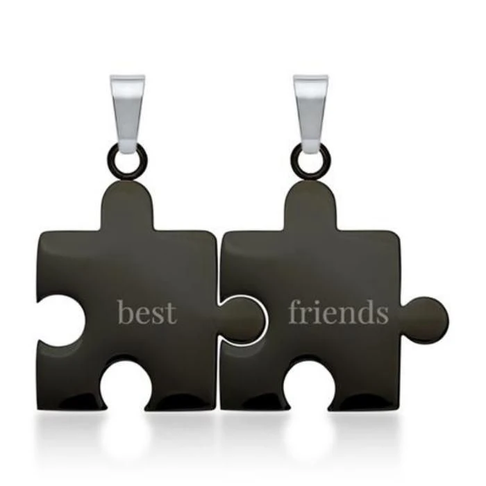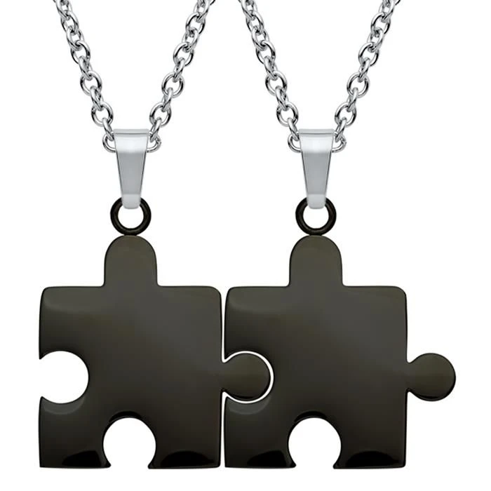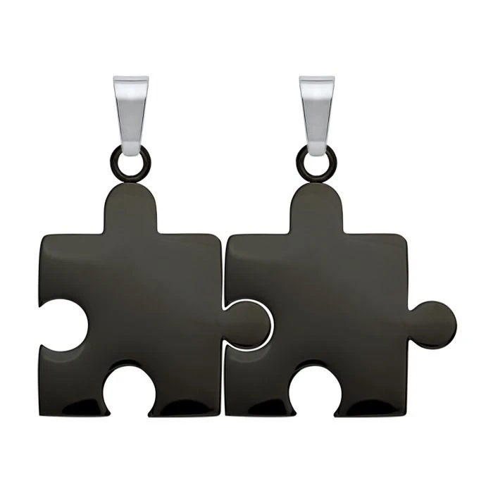 Modernes pendentifs puzzle en acier inoxydable de couleur noire. Une chaine assortie est disponible en option. Une gravure est offerte pour chacun des pendentifs.