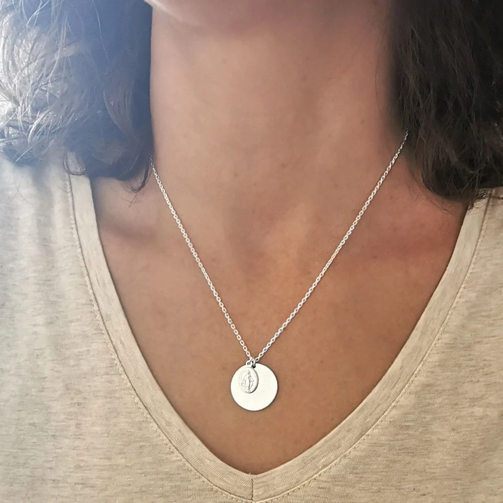 Très joli pendentif religieux en argent 925 composĂ© d’une mĂ©daille ronde personnalisable au recto/verso, ainsi que d’une mĂ©daille miraculeuse reprĂ©sentant la madone. La madone dĂ©signe la reprĂ©sentation picturale de la vierge Marie. AccompagnĂ© de sa chaĂ®ne 45 cm argent assortie, cette mĂ©daille religieuse personnalisĂ©e vous protĂ©gera partout oĂą vous irez. Ce collier prĂ©cieux et personnalisĂ© sera apprĂ©ciĂ© par de nombreux croyants, vous pourrez dĂ©cider de l’offrir lors d’une occasion particulière pour faire plaisir Ă un homme ou une femme qui vous est cher.