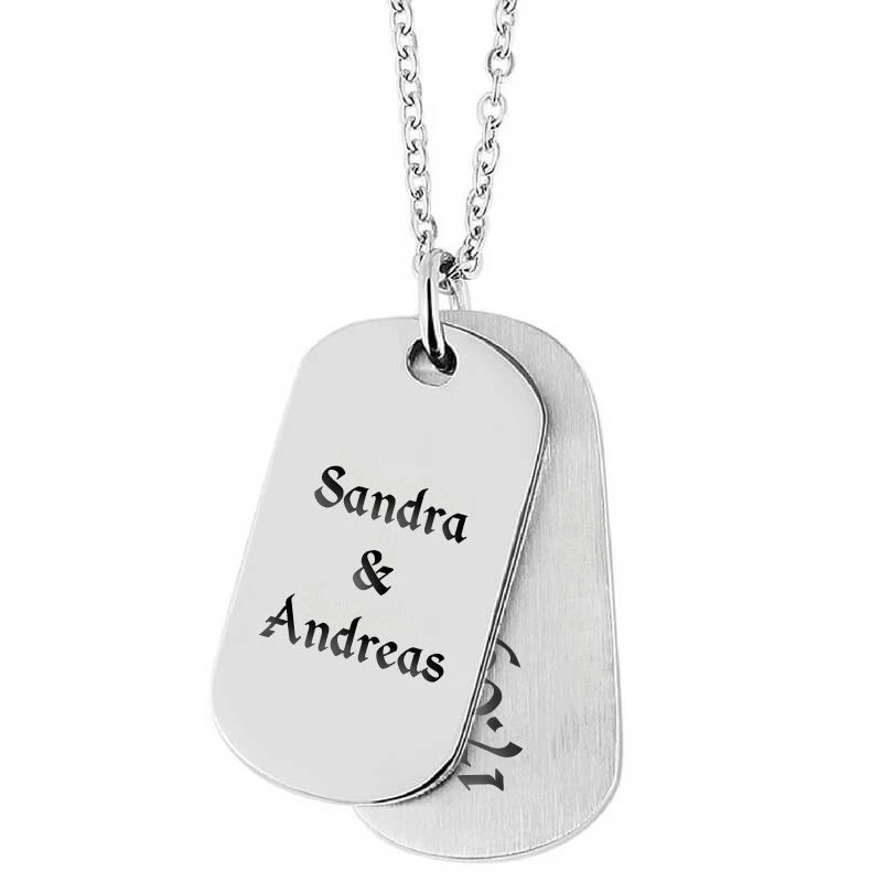 Très original , ces deux pendentifs plaques en acier inoxydable de taille diffĂ©rente. Le plus grand pendentif est en finition brossĂ©e et le plus petit devant est poli. Ces dogtags sont personnalisables sur une ou plusieurs lignes, de sens vertical ou horizontal suivant vos prĂ©fĂ©rences. La première gravure diamant est offerte. C’est un cadeau unique et original.
