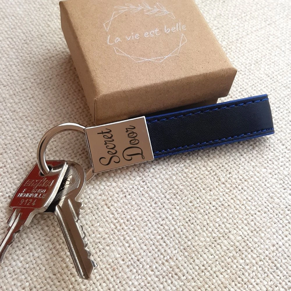 On a tous avec nous un trousseau de clés. Adoptez ce joli porte-clé fin avec sa texture bi-matière en acier brillant et en cuir noir couturé de fils bleus. Vous apprécierez son ouverture pivotante facile qui rendra aisés les changements de clés. Personnalisez-le pour le rendre unique avec une gravure texte, date ou encore un symbole amusant. La première gravure diamant est offerte. C’est le cadeau utile par excellence pour une fête, un anniversaire ou un départ!