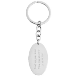 Moderne et original porte clé ovale en acier inoxydable poli. Il est personnalisable au recto/verso sur une, deux ou trois lignes au choix. La gravure diamant est offerte. C’est un magnifique cadeau pour faire plaisir. Offrez un porte-clef personnalisé en y inscrivant un sentiment fort ou une date de rencontre importante fera de cet accessoire un bijou unique et très personnel.