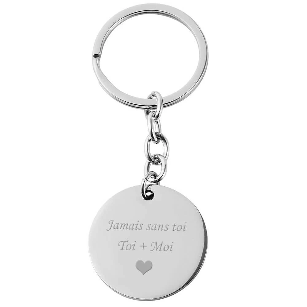 Moderne et original porte clé dogtag rond en acier inoxydable poli. Il est personnalisable au recto/verso sur une, deux ou trois lignes au choix. La gravure diamant est offerte. C’est un magnifique cadeau pour faire plaisir. à un être cher. Offrez un porte-clef personnalisé en y inscrivant un sentiment fort ou une date de rencontre importante fera de cet accessoire un bijou unique et très personnel.