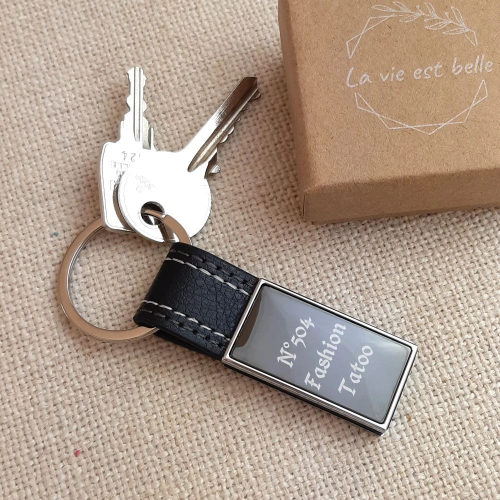 On a tous avec nous un trousseau de clés. Adoptez ce porte-clé original en forme de rectangle avec sa texture bi-matière en métal brillant et en cuir noir couturé de fils blanc et gris. Personnalisez-le pour le rendre unique avec une gravure texte, date ou encore un symbole amusant. La première gravure diamant est offerte. C’est le cadeau utile par excellence pour une fête, un anniversaire ou un départ!