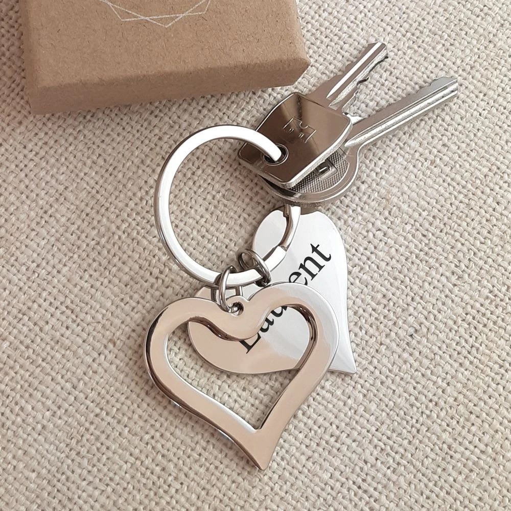 Pourquoi ne pas graver une citation inspirante sur ce porte clé en forme de cœur afin d’encourager la personne qui le reçoit en cadeau ?  Un poème ou un encouragement qui l’accompagnera au quotidien. Il est composé d’un cœur vide et d’un cœur plein et d’un grand anneau de 3.5 cm de diamètre. Une gravure diamant est offerte.
