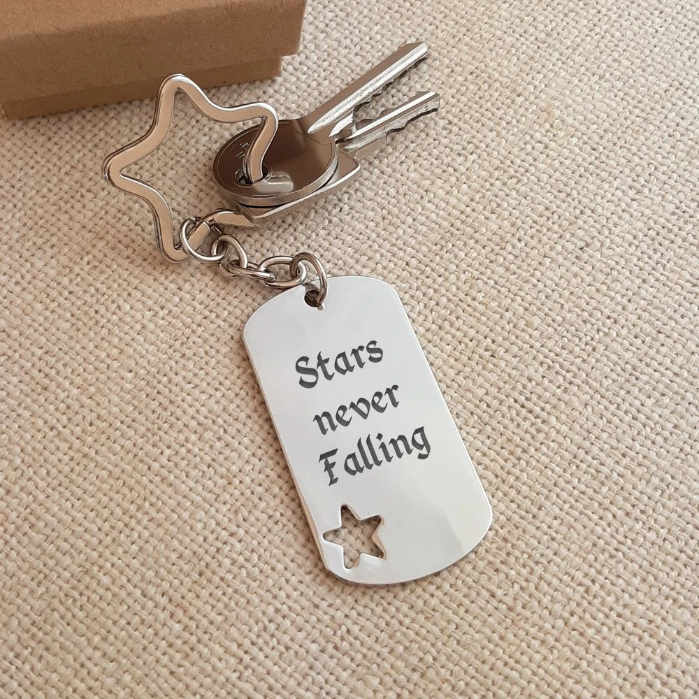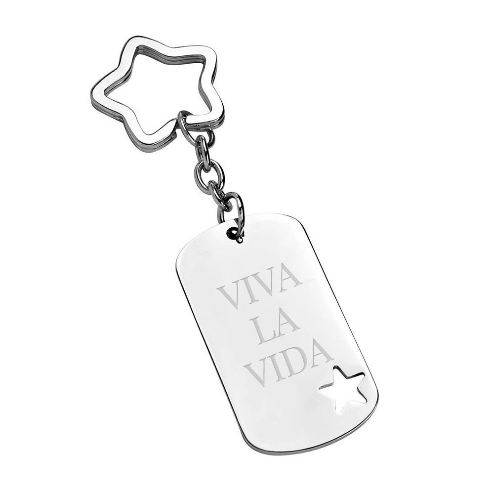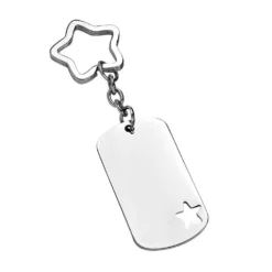 Optez pour ce porte-clé plaque avec sa petite étoile et son original anneau en forme d’étoile. Pratique et joli pour rassembler vos clefs, il est aussi personnalisable avec la gravure d’un mot, d’une date ou encore d’un symbole avec la première gravure diamant offerte. Vous ferez forcément plaisir en toute occasion en offrant ce porte-clé personnalisé.