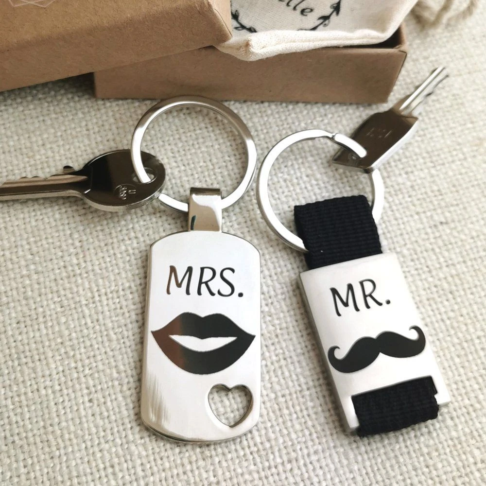 Original et superbe portes clés acier duo Mr et Mme personnalisables au verso avec une longue gravure laser offerte. Faites graver joli message tendre ou bien même une citation, ces 2 portes clés acier feront leur effet sans aucun doute auprès des hommes et des femmes. Déclarez votre amitié ou votre amour en 100 caractères réalisable sur chaque porte clé. Un véritable cadeau unique à offrir pour faire plaisir.